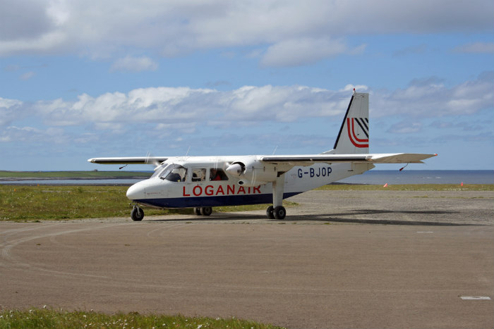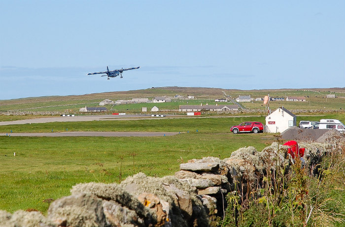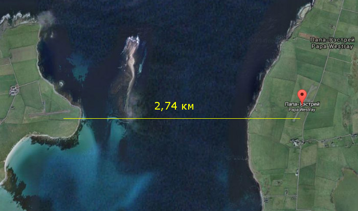Легкий пассажирский самолет BN-2 совершает рейс между островами Вестрей (Westray) и Папа Вестрей (Papa Westray), расположенные друг от друга на расстоянии 2,74 км. Находясь на одной взлетно-посадочной полосе можно свободно разглядеть другую на соседнем острове. В аэропорту острова Вестрей работает 3 человека, а население всего остова составляет около 70 человек.