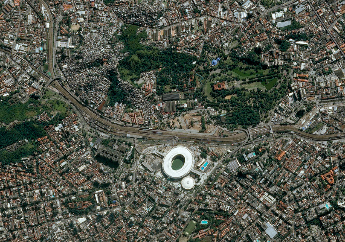 Самый большой стадион в мире имеет овальную форму. У центрального входа стоит бронзовая статуя футболиста, олицетворяющая победу бразильской команды в чемпионате мира 1958 года.