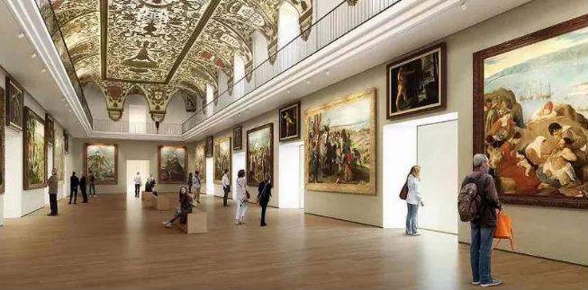 Произведения разделены в зависимости от школ, из которых вышли их авторы: испанская (Эль Греко, Веласкес, Сурбанара), немецкая (Дюрер, Кранах), французская (Пуссен, Лоррен), английская (Гейнсборо, Лоуренс), фламандская (Вейден, Босх, Мемлинг) и т.д.