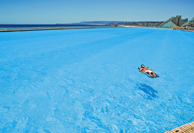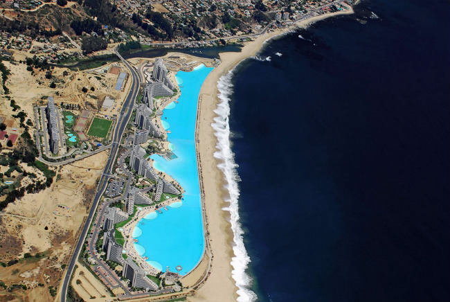Самый большой бассейн в мире находиться на чилийском курорте Сан Альфонсо дель Мар (San Alfonso del Mar). Длина этого монстра составляет более 1 км, а ширина 150 м, в него помещается более 250 тыс м³ морской воды. В некоторых местах глубина доходит до 35 м.  Постройка по площади может быть сравнима с 6 тыс стандартными бассейнами.