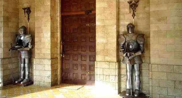Отель получил категорию 4 звездочного. Внешне он очень колоритен: на входе стоят два железных рыцаря, которые как бы охраняют здание, немного левее расположено искусственное озеро с золотыми рыбками, где каждый может бросить монетку.