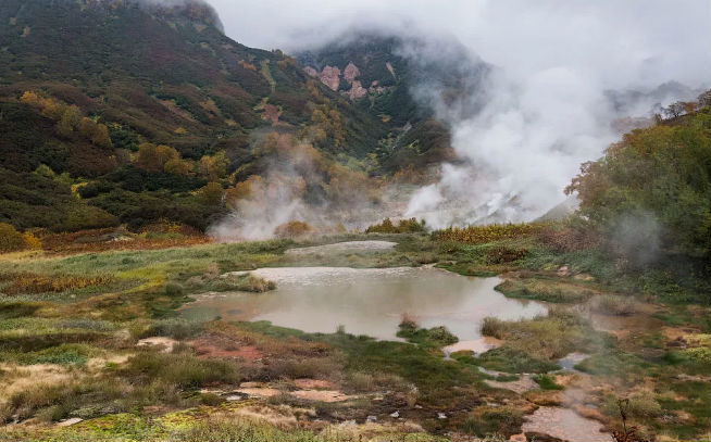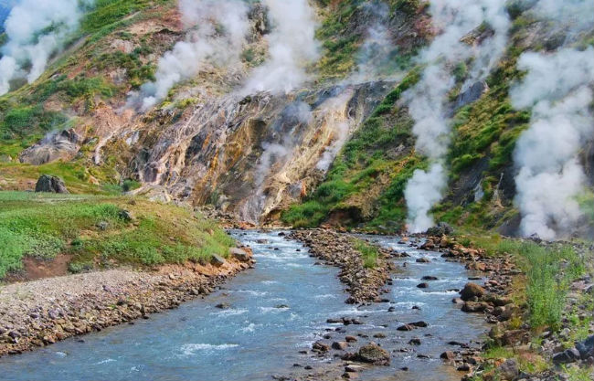 Долина гейзеров на Камчатке – одно из самых живописных мест Российской Федерации и единственное гейзерное поле в Евразии. По количеству гейзеров занимает второе место после США. Долина внешне представляет собой небольшой каньон, в ущелье которого протекает река. Поверхность крутых берегов, спускающихся к ней, полностью усеяна многочисленными фонтанами, испускающими струи горячей воды, пара и газа.